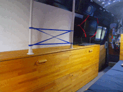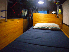 ←サイドボード 青色のゴムバンドと支柱でバック パックなどを置いても大丈夫 →ベッドと読書用のゼットライト |