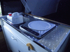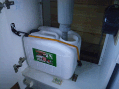 H排水タンクは20リットルのポリ容器を流用しミニキッチン下部に収容する