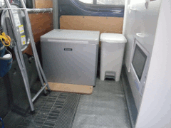 ↑シンクと水タンク(給水設備) 右上写真の水タンクは排水設備 →冷蔵庫とゴミ箱 ↓サイドドアから見たキッチン他 |