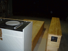 ←ベッドのフレーム ↓ベッド・キッチン・棚を車庫で 仮配置(フロント側から) |