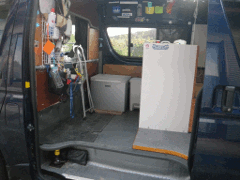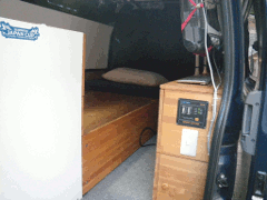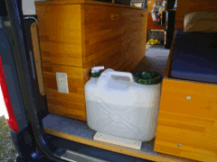↑ベッド内に設置したインバータ (1.5kW)とバッテリ(130AHx2, 24V) ←予備の水タンク(20L)と サイドボード内に仕込んだ サービスコンセント |