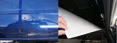 私は、先述の順番で、あまり車体の構造、とりわけ屋根の補強材であるリブの位置に注意することもなく、「エィ!」とばかりに屋根から穴を開けてしまいました。後で、天井の内張りを剥がしたらビックリしました。幸運にもリブを避けた場所に穴が開けられていたのですが、もしもリブの周辺やリブそのものに穴が開いていたら、穴あけをやり直す必要があったかもしれません。なぜなら、天井裏側には、ブラケットを固定し補強するための鉄片を取り付ける必要がありますので、リブを避けた方が良さそうです。