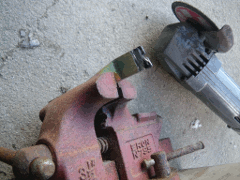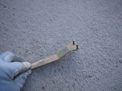 丁度手元に、ディスクグラインダーのネジを締める工具が余っていたので、これを流用して加工し、専用のツールを作りました。先端に5mm程度の幅の凹部を作って、その凹部をボタン状のパーツと天井材との間に差し込んで、テコでボタン状のパーツを引き抜くというものです。