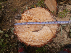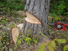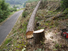 手始めに家の近くにある黒松2本を伐採してみました。チェーンソーを使ったことはあるのですが、直径が30cmもあるような立ち木を伐採するのは初めてです。言わば、初心者なのでインターネットで、立ち木の伐採方法について学習しました。 このページ は大変参考になりました。受け口は直径の1/3〜1/4、追い口は受け口の約2/3の高さのところで切る。今までは、こんなことも知らずに適当に切っていました。斜面のどちらに倒すのが安全なのかも、このページでしっかり勉強できました。