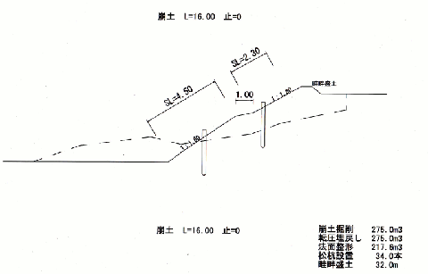 結局、崩壊した畦畔の復旧は地元の土木工事屋さんにお願いすることにしました。なるべく費用を安くしたいとの希望を伝えたところ、杭を30本程用意してもらえれば、○○万円程度の予算で施工してあげるといわれました。左図は、見積書に添付されていた工法を示す図面です。