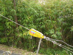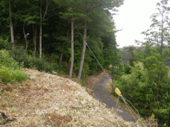 学習の後は実習あるのみです。用心のために木をワイヤーとチルホールで引っ張りました。ヤッター!思ったとおりの方向に倒すことができました。玉切りして、先を尖らせれば杭の完成です。