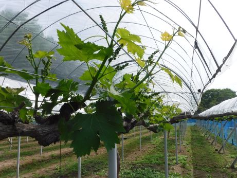 昨日は雨や強風だったのでブドウ園には行きませんでしたが、今日は朝一番にブドウ園の山際法面の草刈りをしました。その後、ピオーネの棚を覗いてみると、展葉6~7枚になっていたので、摘穂を開始しました。(摘穂とは、新梢1本につき、花穂1個にするという作業です。) 農業日誌を見ると、ピオーネの摘穂作業は昨年よりも5日遅くなっています。