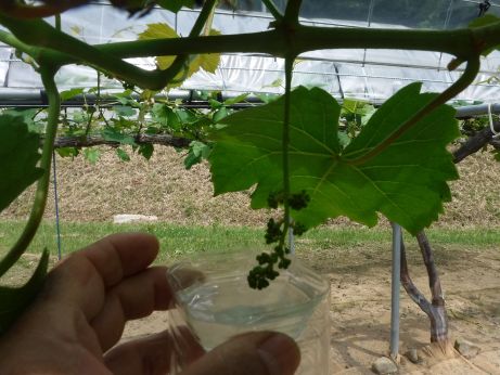 デラウェアのジベ処理1回目は、「満開14日前にすること」とされていますが、満開日を予測するのは困難です。一般的には、平均展葉数が9.5枚になった時点が適期であるとされていて、我が家のデラウェアは「今でしょ!」というタイミングです。ジベレリン100ppmにフルメット5ppmと加用することで、ジベ処理の適期を「満開14日から18日前」と4日間広げることができるようなので、それに従いました。昨年よりも4日遅い1回目ジベ処理日でした。今日から数えて18日後である6月11日になっても満開していない房はジベ処理を失敗している可能性が高いことになります。ジベ処理というのは、種無しにする処理なので、我が家で自家消費する分には多少種があってもどうってことはないとも言えます。
