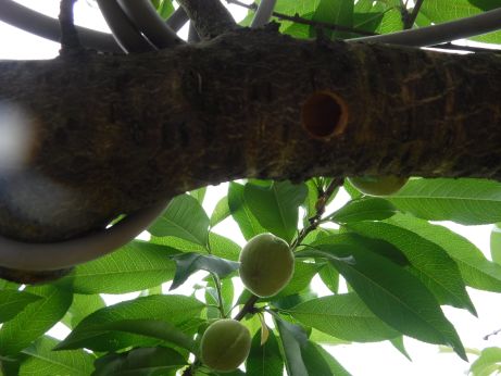 3日程前に摘果を行ったモモの樹の下の見ると、なにやら木屑のようなものが落ちていました。これは一大事です。木を見ると、直径5㎝位の枯れた枝の下側に直径8mm位の真ん丸な穴が明いていました。