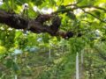 安芸クイーンの棚下に 光反射用のシートを敷き詰めました。何もしないと色づきが悪くて、まだら着色になってしまいます。5年程前から光反射シートを使っていて、手間とコストが掛かりますが背に腹は代えられず、毎年光反射シートを使っています。去年からシートの材質を変えました。今年は、昨年使ったシートを再利用しているので、少し汚れていますが、問題ないでしょう。