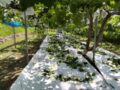 今年、シャインマスカットには、2種類の袋を使い分けしました。ピオーネとの詰め合わせに使う分は早く登熟してほしいので、薄い緑色の袋を、冷蔵保存する分は登熟は遅くても良いので濃い緑色の袋をかけました。