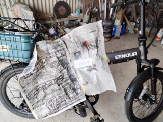 最近買った折りたたみ式自転車に名前を書こうと思いましたが、フリーハンドで書くのは避けて、ステンシルを作ってスプレーすることにしました。ステンシルを作るのは今回が初めてです。レーザープリンターで印刷した PPC をカッターナイフで切ってみたところ、うまくいきそうな感触です。被塗装物との密着性を良くするために、スプレーのりを使ってみましたが、のりが蜘蛛の巣のように 切り文字の部分について よろしくありませんでした。そこで ラベル用紙に印刷して、文字を切り取り、被塗装物に貼り付けて、 塗料をスプレーしました。ばっちり うまくいくだろうと思っていましたが、見事 失敗でした。塗料がうまく乗らなかったからです。被塗装物に下地処理をしておくべきでした。