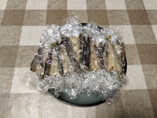 頭を切って、背開きにして 腹わたを取り出し、約4%濃度の塩水に1時間ほど浸して、かごに入れます。昨日の夕方から 今日の夕方まで約24時間、風通しの良い日陰で干しました。あまり干しすぎるとバリバリして 食感がよくありません。少し柔らかい ぐらいが グッドです。一つずつ サランラップで包んで冷凍庫に入れて保存します。欲しい時に欲しい数だけ取り出して炭火で炙れば、良い酒肴になります。市販ではまず手に入らない 品物なので、何とも スペシャルな感じです。