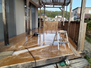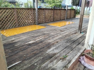 上の写真は、人工芝を剥いだ後の老朽化したウッドデッキの様子です。最初に写真の一部にあるように塗装合板を敷き詰めました。下の写真はその時の仕上がりの様子です。この後 上に何を敷くのか 娘夫婦が決めて、発注した材料が届いたので今日の工事になりました。