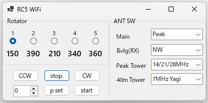 5基のローテータと4個のアンテナスイッチを操作できるようにします。実はローテータは4基しか存在しませんが、1基は予備です。ローテータを操作する時には、ラジオボタンで操作するローテータを1つだけ選択して、CW/CCWなどの操作を行います。各ローテータの方位角をラジオボタンの下に表示します。アンテナスイッチは、コンボボックスの中から選択することにしました。
