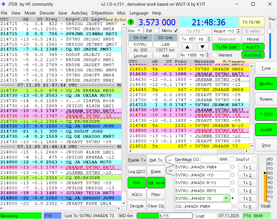 今朝も9U1RUを求めて、暗い内からワッチしていました。9U1RUはデコードできるのですが、呼んでも応答はありませんでした。その内に、午前7時前にはフェードアウトしてしまいました。80mバンドはもう少しフェードアウトする時間が遅いので、QSYしてワッチを開始すると、5V7RUが出ていました。暫く呼ぶと応答があり、バンドニューをゲットすることができました。