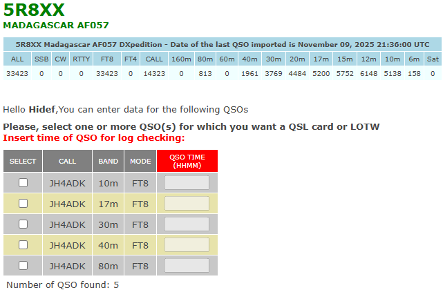 その前に、5R8XX(Madagascar)が3567kHzに出ていたので、これも結構辛坊強くコールしてQSOできました。ログを見ると。5R8XXは未だ160mにはQRVしていないようですし、11月12日までの予定なので、恐らく160mバンドには出てこないのだろうと思います。5R8XXとは80mの他17mでバンドニューをプレゼントして貰いました。