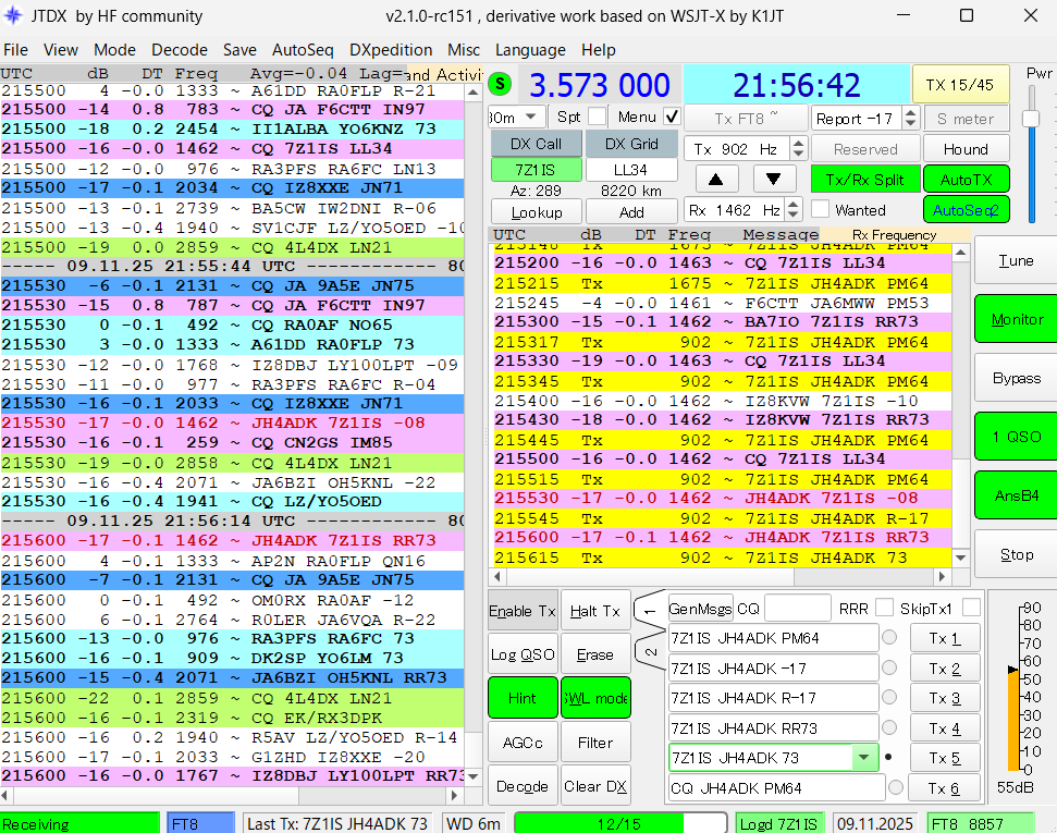 二日前に80mバンドで5V7RUとQSOした時に見かけた7Z1ISが、今日も3573kHzにQRVしていました。今度見つけたらQSOしようと思っていたので、辛坊強くコールしたところ何とかQSOできました。
