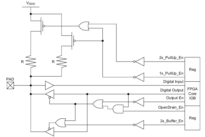 topという名前のモジュールを定義しており、5本の入力と5本の出力を持っています。(* *)で囲まれた部分は属性を定義しており、トップレベルの定義らしく、iopad_external_pinという属性を与えています。少し前に試したblink_ledという例題では、( top ) module blink(・・・と定義されていました。この例では、( top *)との記述がありませんが、topという名前だからトップレベルモジュールと認識されるのでしょうか? clkbuf_inhibitという属性が何を意味するのか不明ですが、まぁ良いとしましょう。clk_enやspi_miso_en,led_enという外部信号は不要なのではないかと思っていましたが、ピン割り当ての際に、どのGPIOにもIN, OUT, ENという信号が存在することに気付きました。どうやら、このFPGAの出力信号にはEN(enable)信号が必要なのでしょう。