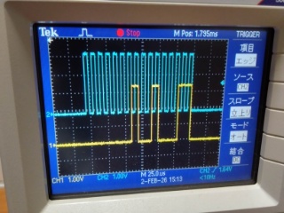 ShrikeLiteというRP2040+FPGAが搭載されたボードで遊んでいます。MicroPythonをRP2040側で動作させて、FPGA側に組み込んだSPIのデバッグをしている時の話です。SPIを経由してFPGA側から32ビットのデータが読み出せるようにしたかったので、FPGA側ではデータ幅32ビットのSPIを作り込みました。シミュレータで動作確認したところ良い感じに動作していましたが、RP2040側でデータを読み出すと、0x01234567という固定データが読み出される筈なのに、0x23672367と読み出されるのです。何でだろう?と思って、とうとうオシロスコープまで接続して波形を確認すると、何とSCKが32でも8でもなく、16づつ出ているではありませんか!これが冒頭の画像です。MSBfirstなので、データは0x0123と読取る事ができます。