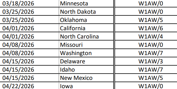 アメリカ独立250周年を記念して、ARRLのクラブ局であるW1AWが全米各州を巡回運用しています。詳しくはこちらのpdfをご覧ください。今週(3月25日から7日間)は、North Dakotaの番です。今朝、DX ClusterでW1AW/0を探してみたところ、21030kHz(CW)に出ているという情報を得たので、QSYしてみるとCQを出していました。コールすると直ぐに応答がありましたが、欲しいのはCWではなくPhoneです。この一週間のうちになんとかQSOしたいものです。