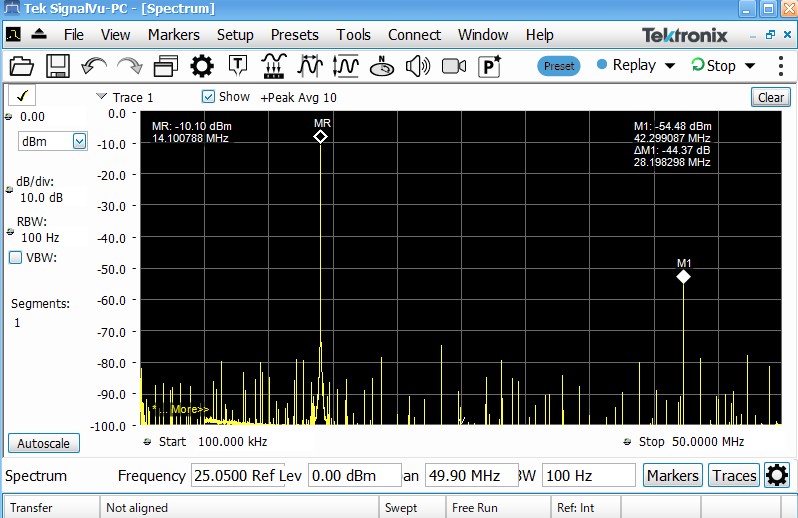 スペアナを使って、14.1MHzで発振させた時のスペクトルと電力を測定してみました。スペアナとLPFの間には20dBのアッテネータを入れているので、出力レベルは10.1dBm(10mW)です。スプリアスは3次が-44.37dBcなので基準値-40dBcをクリアできています。近傍には目立ったスプリアスはありません。